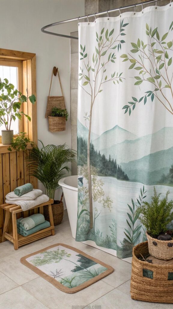 To enhance the nature theme, consider adding potted plants or natural wood accents in your bathroom. A shower curtain with a watercolor landscape or a tropical print can serve as a beautiful backdrop for your space. Pair it with earthy tones in your towels and bath mats for a cohesive look.