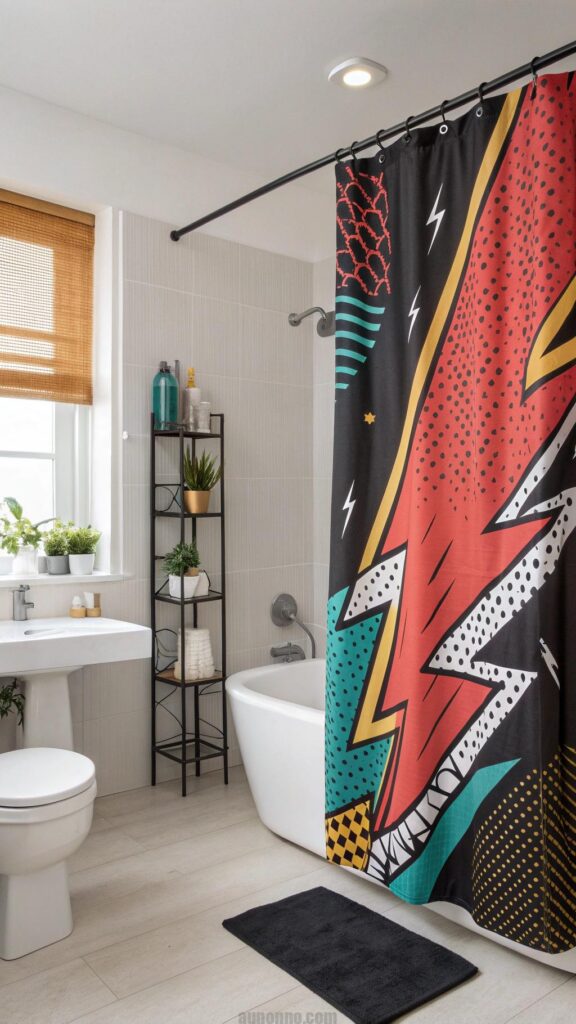 Graphic prints can make a bold statement in your bathroom. Look for shower curtains featuring striking designs, such as typography, abstract art, or bold illustrations. These prints can serve as a focal point, drawing attention and adding personality to your space.