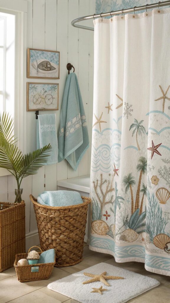 If you love the ocean, consider a beach-themed shower curtain to bring coastal vibes into your bathroom. Look for designs featuring seashells, waves, or tropical motifs. This approach can create a relaxing atmosphere reminiscent of a beach getaway.