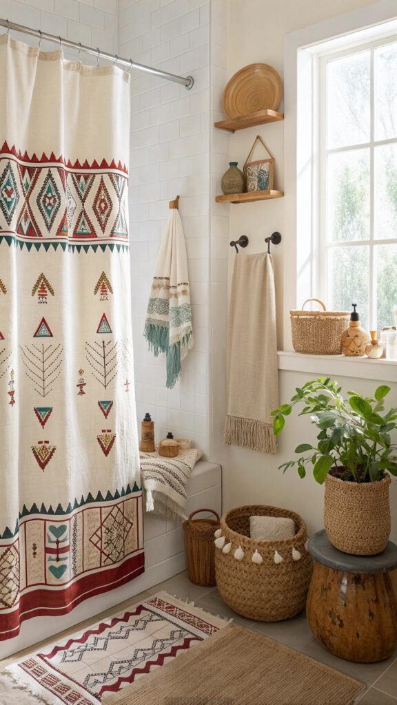 Incorporating cultural elements into your bathroom decor can create a unique and enriching atmosphere. Look for shower curtains that feature traditional patterns, motifs, or colors from different cultures around the world. This approach not only adds visual interest but also tells a story and reflects your appreciation for global aesthetics.