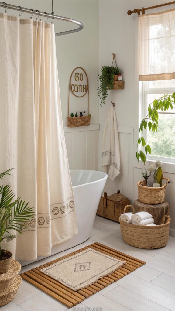 Layering textiles can add depth and warmth to your bathroom decor. Consider using a sheer curtain behind a more opaque shower curtain to create a soft, diffused light effect. This technique can also add visual interest and texture to your space.