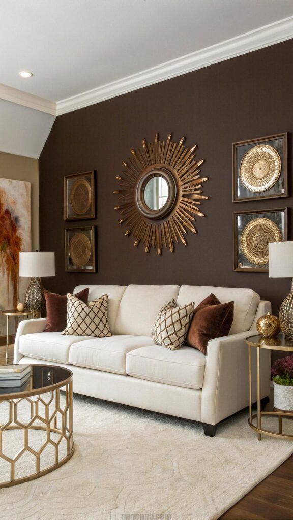 Pair the accent wall with light-colored furniture to create contrast. A white or cream sofa works well against a brown wall, making the space feel balanced. Add metallic accents like gold or copper for a touch of glamour.