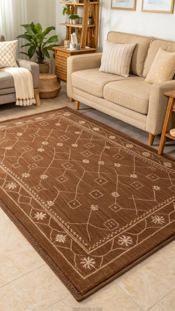 Pair the rug with neutral furniture to create a harmonious look. A beige or gray sofa works well with a brown rug, creating a balanced color scheme. Add wooden furniture to enhance the natural feel.