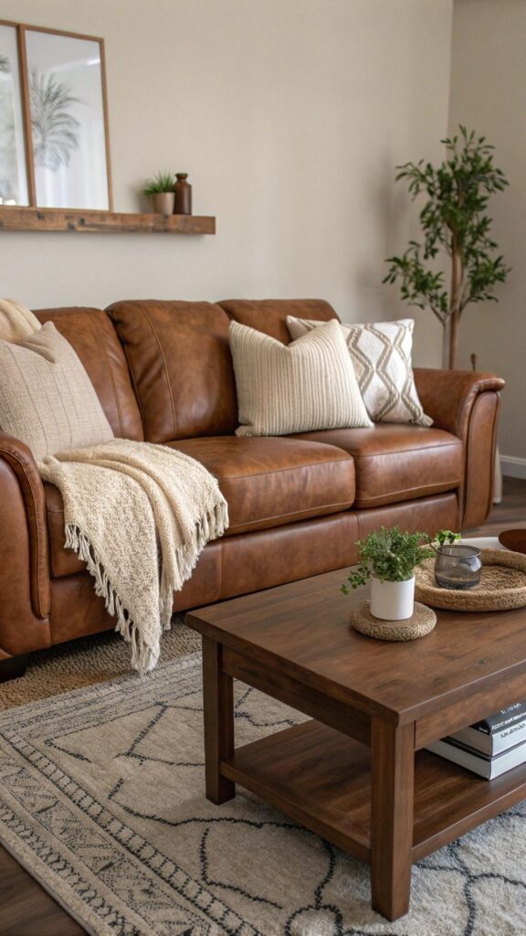 A brown leather sofa is a timeless piece that adds sophistication to any living room. It pairs well with neutral walls and wooden furniture, creating a cohesive look. The texture of leather also adds depth and richness to the space.