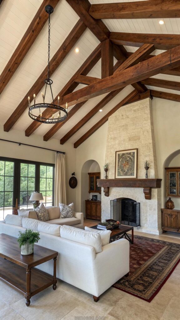 Decorate the room with earthy tones and natural materials to complement the beams. This combination enhances the rustic aesthetic of the space. The ceiling beams serve as a focal point and tie the room together.
