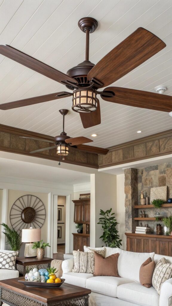 Pair the fans with neutral walls and furniture to create a balanced look. A white or beige sofa works well with brown ceiling fans, making the space feel harmonious. Add a few metallic accents for a touch of sophistication.
