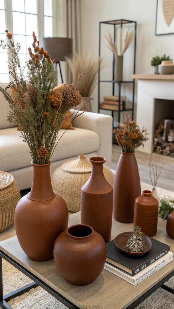 Fill the vases with dried flowers or greenery for a natural touch. This combination enhances the earthy aesthetic of the space. The vases serve as both decor and functional pieces.