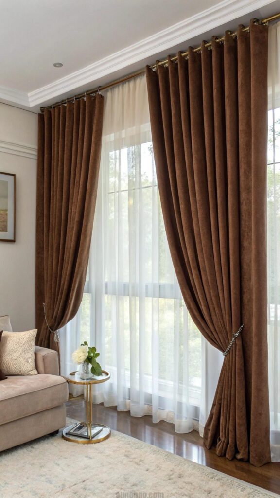 Brown curtains can add elegance and warmth to your living room. Choose heavy fabrics like velvet or linen for a luxurious feel. These curtains also help block out light, making the room feel cozy.