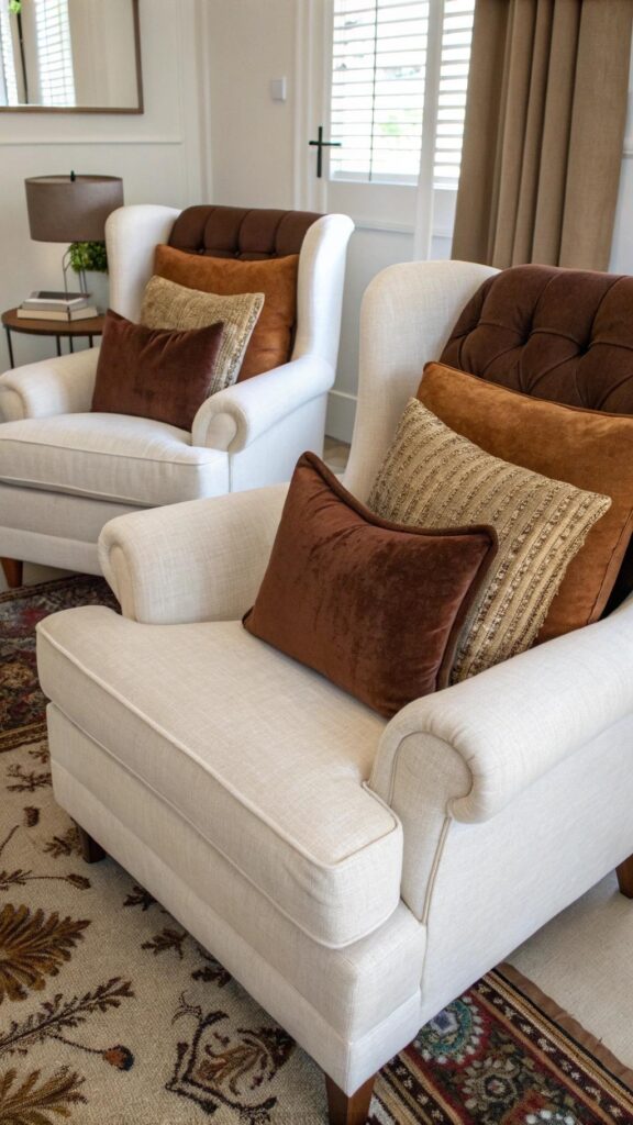 Pair the cushions with neutral armchairs to create a balanced look. A white or beige armchair works well with brown cushions, making the space feel harmonious. Add a few accent pillows in complementary colors.