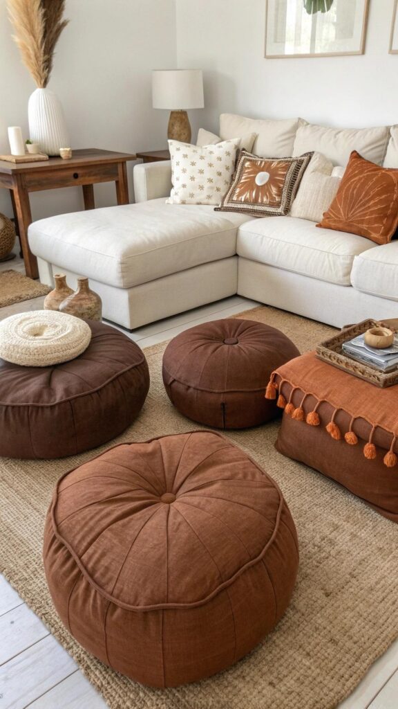 Pair the cushions with neutral furniture to create a balanced look. A white or beige sofa works well with brown floor cushions, making the space feel harmonious. Add a few accent pillows in complementary colors.