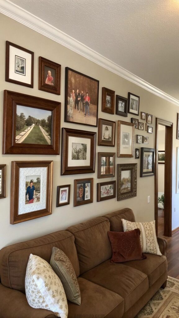 Hang artwork or mirrors on the accent wall to enhance its visual appeal. Choose pieces with warm tones to complement the brown. This setup creates a cohesive and stylish look.