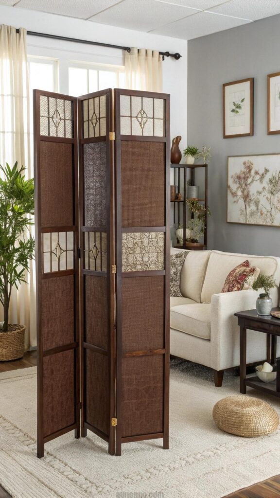Pair the dividers with neutral furniture to create a balanced look. A white or beige sofa works well with brown room dividers, making the space feel harmonious. Add a few metallic accents for a touch of glamour.