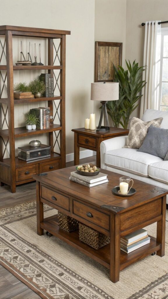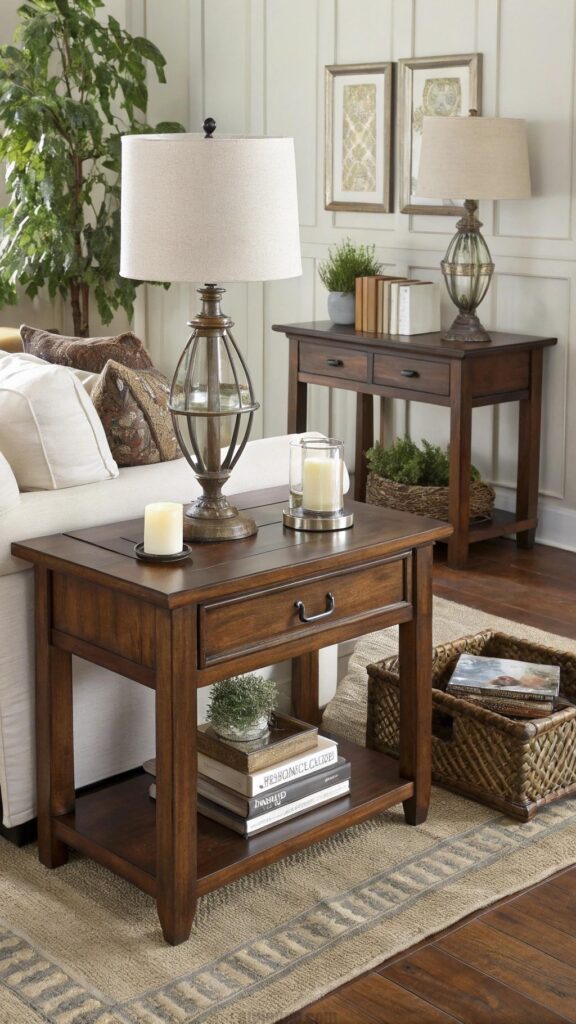 Decorate the tables with small accessories like candles, books, or plants. These items add personality and make the room feel lived-in. The combination of wood and decor creates a cohesive look.
