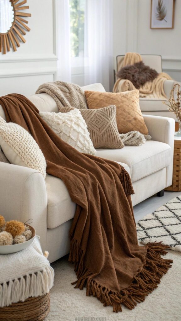Pair the blankets with neutral furniture to create a balanced look. A white or beige sofa works well with brown throw blankets, making the space feel harmonious. Add a few accent pillows in complementary colors.