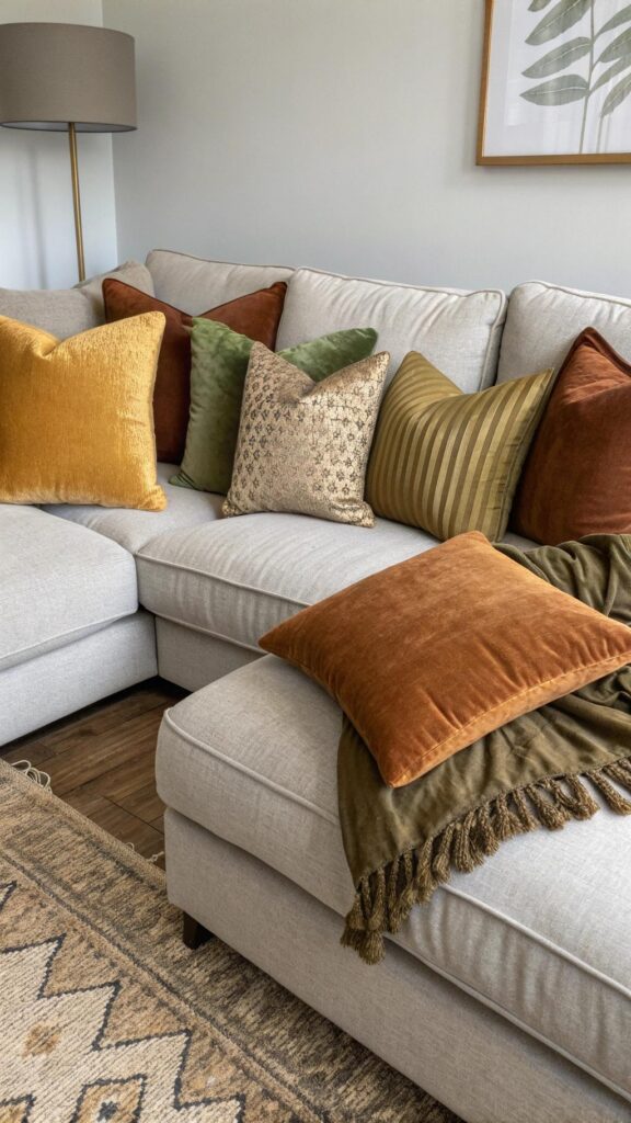 Use accent colors like mustard, olive green, or navy blue. Add these colors through pillows, artwork, or decor items.