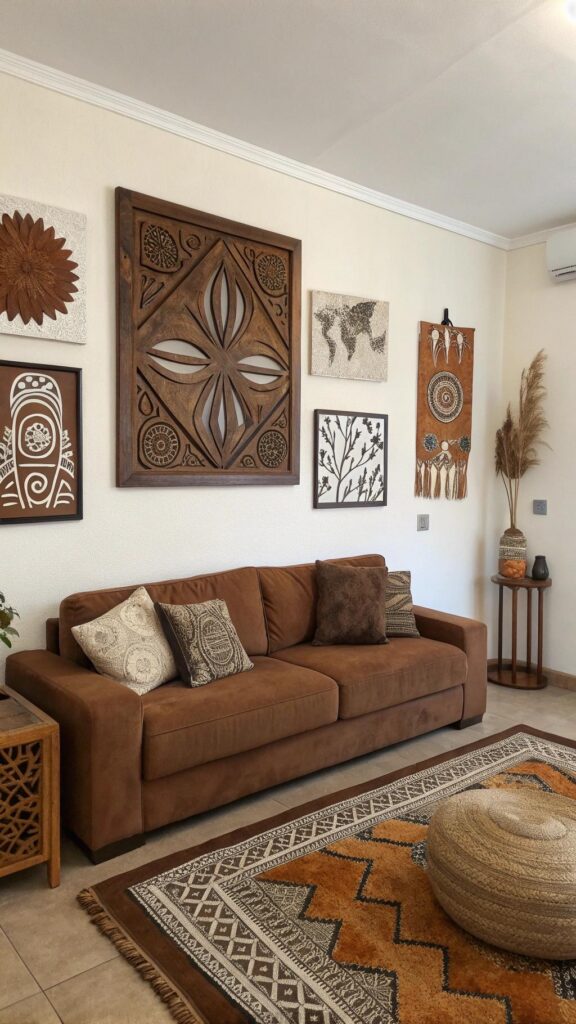 Brown wall art can add warmth and personality to your living room. Choose pieces with earthy tones or abstract designs to complement the color scheme. This art serves as a focal point and ties the room together.