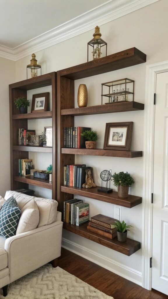 Pair the shelves with light-colored walls to create contrast. A white or beige wall works well with brown shelves, making the space feel balanced. Add a few metallic accents for a touch of glamour.