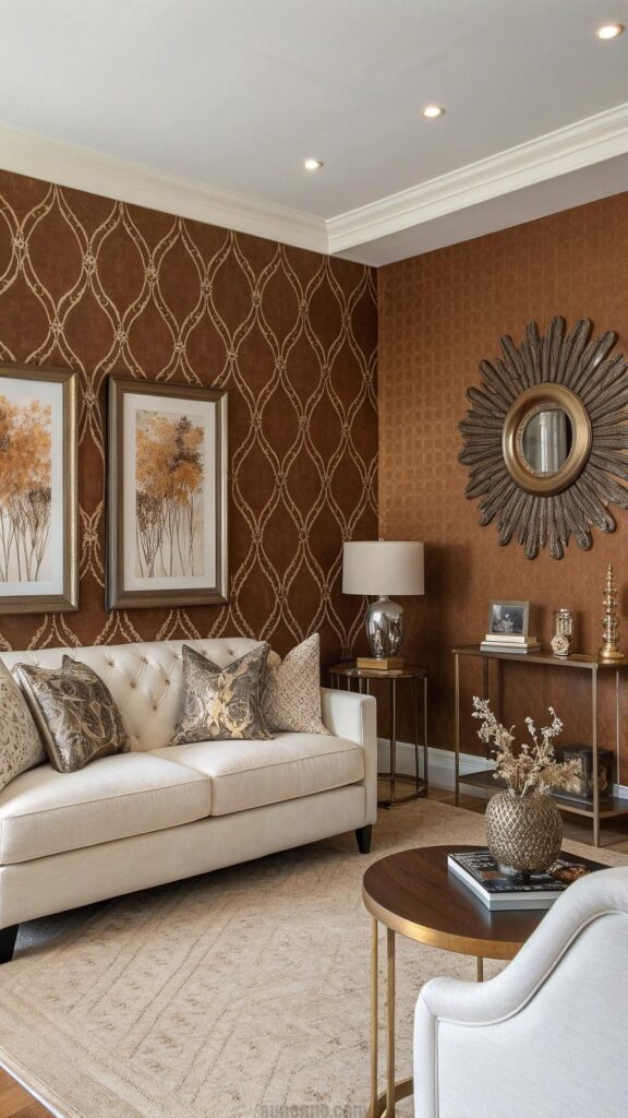 Pair the wallpaper with light-colored furniture to create contrast. A white or beige sofa works well with brown wallpaper, making the space feel balanced. Add a few metallic accents for a touch of glamour.