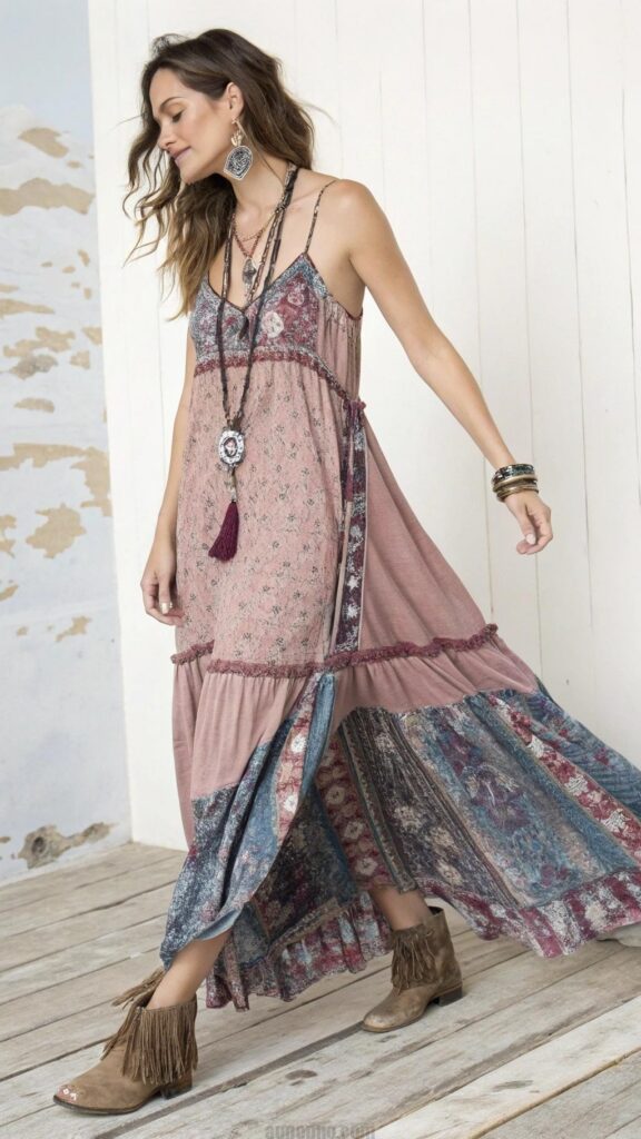 For a more formal bohemian look, opt for a maxi dress in a rich fabric like silk or a deep jewel tone. Accessorize with layered necklaces and statement earrings to enhance the boho aesthetic. If the wedding is more casual, a lightweight cotton maxi dress can be paired with flat sandals for a relaxed yet chic appearance.