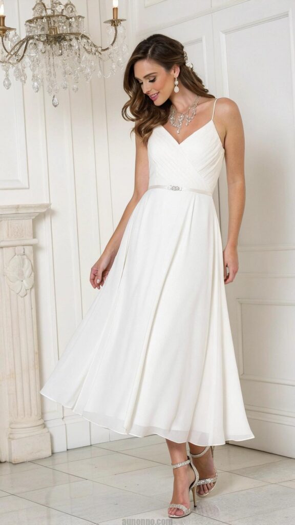A tea-length dress is a sophisticated option that falls between the knee and ankle, making it perfect for both formal and semi-formal weddings. This style offers a vintage-inspired look that is both elegant and playful. Choose a tea-length dress with a fitted bodice and a flared skirt for a flattering silhouette. Pair it with classic pumps or strappy heels for a polished appearance.
