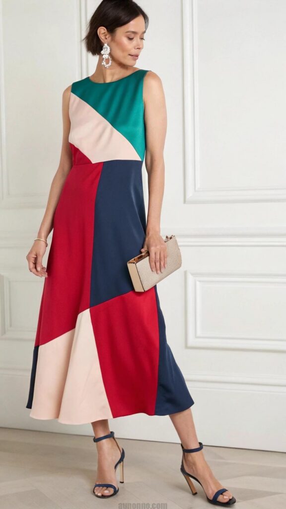 For a formal wedding, opt for a color block gown that combines rich hues and luxurious fabrics. Add statement earrings or a bold clutch to elevate your outfit. If the wedding is more casual, a knee-length color block dress can be paired with cute sandals for a relaxed yet stylish appearance.