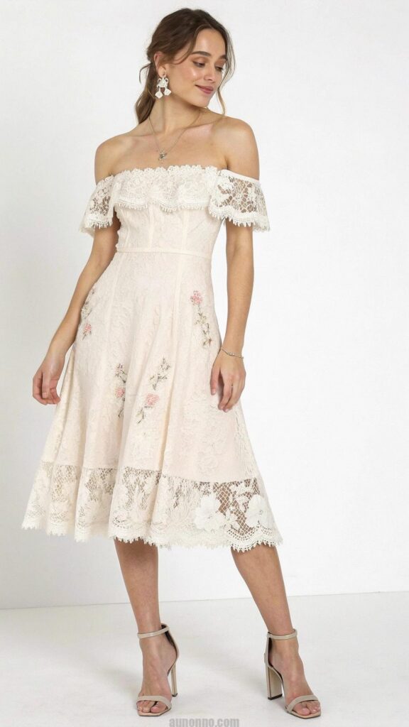 An off-the-shoulder dress is a romantic and feminine choice for wedding guests. This style highlights the shoulders and collarbone, creating an elegant silhouette. Choose a dress with delicate details, such as lace or embroidery, to enhance the romantic vibe. Pair it with strappy heels and dainty jewelry for a polished look.