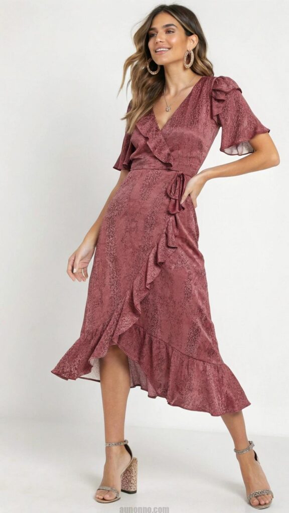 For a more formal wedding, opt for a wrap dress in a luxurious fabric like silk or a deep jewel tone. Accessorize with statement earrings or a bold clutch to elevate your outfit. If the wedding is more casual, a cotton printed wrap dress can be paired with cute flats for a relaxed yet stylish appearance.
