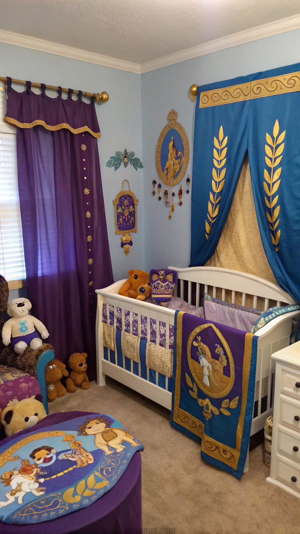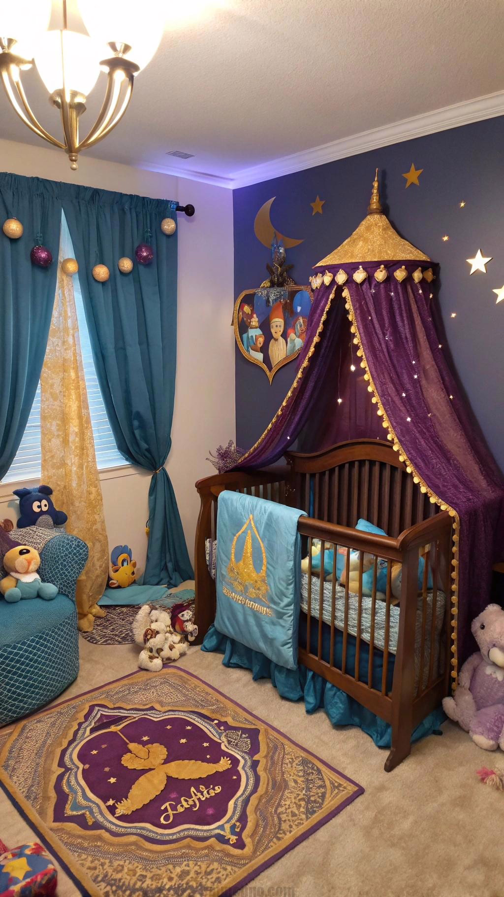 Transform your nursery into a magical oasis inspired by Aladdin and the enchanting world of Agrabah. Use a rich color palette of deep blues, golds, and purples to create a luxurious and mystical atmosphere. Start with Aladdin-themed bedding and curtains that feature characters like Aladdin, Jasmine, and the Genie.