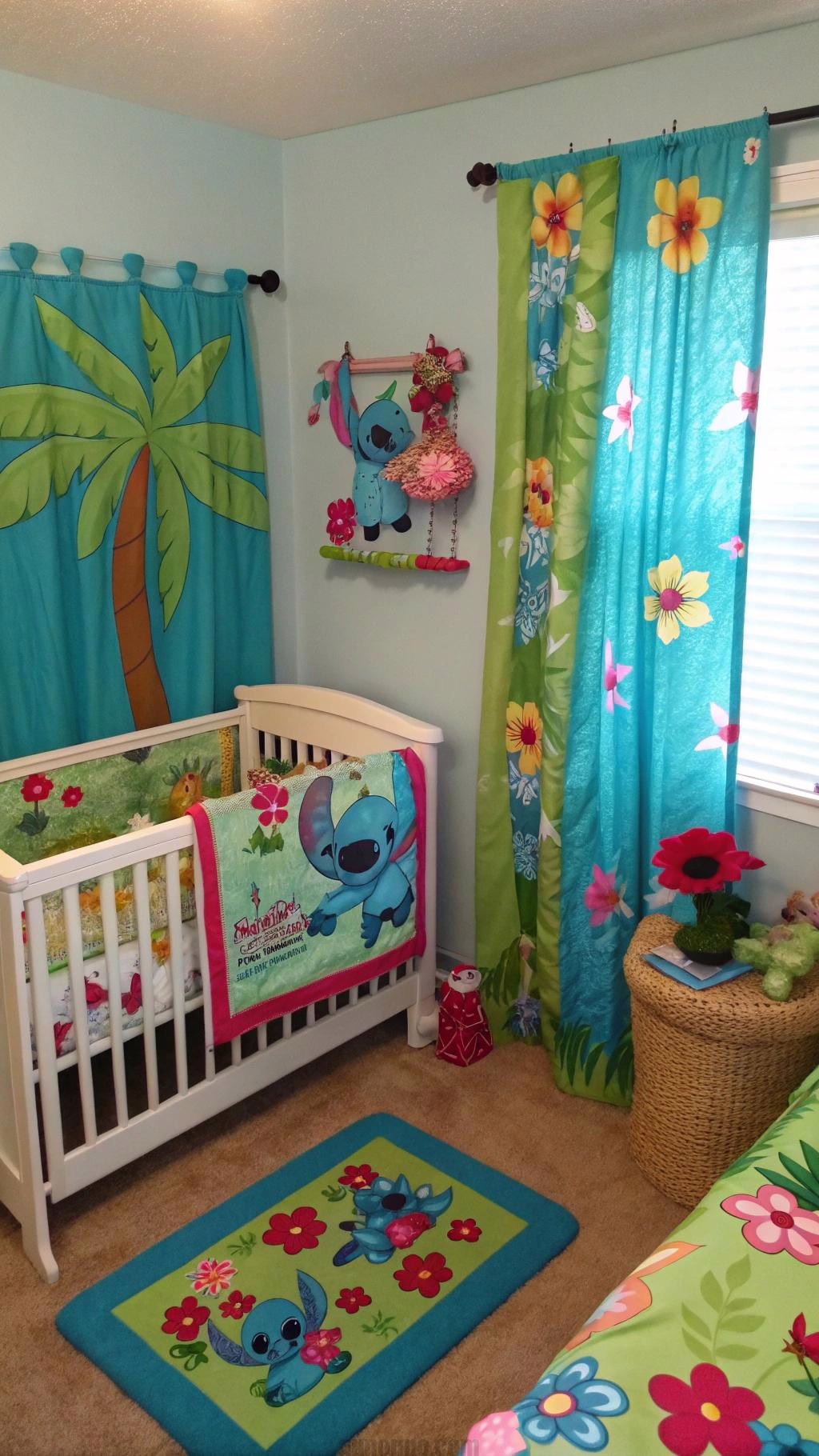 Incorporate furniture that reflects the tropical theme, such as a crib with palm tree designs or a changing table adorned with hibiscus flowers. You can also add plush toys of Lilo, Stitch, and other characters to create a playful environment.