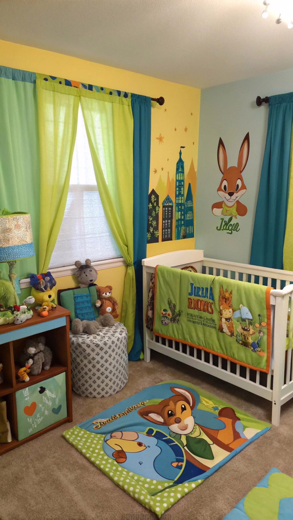 Bring the vibrant world of Zootopia into your nursery with a fun and colorful theme. Use a lively color palette of bright greens, yellows, and blues to create an energetic atmosphere. Start with Zootopia-themed bedding and curtains that feature Judy Hopps, Nick Wilde, and other beloved characters.