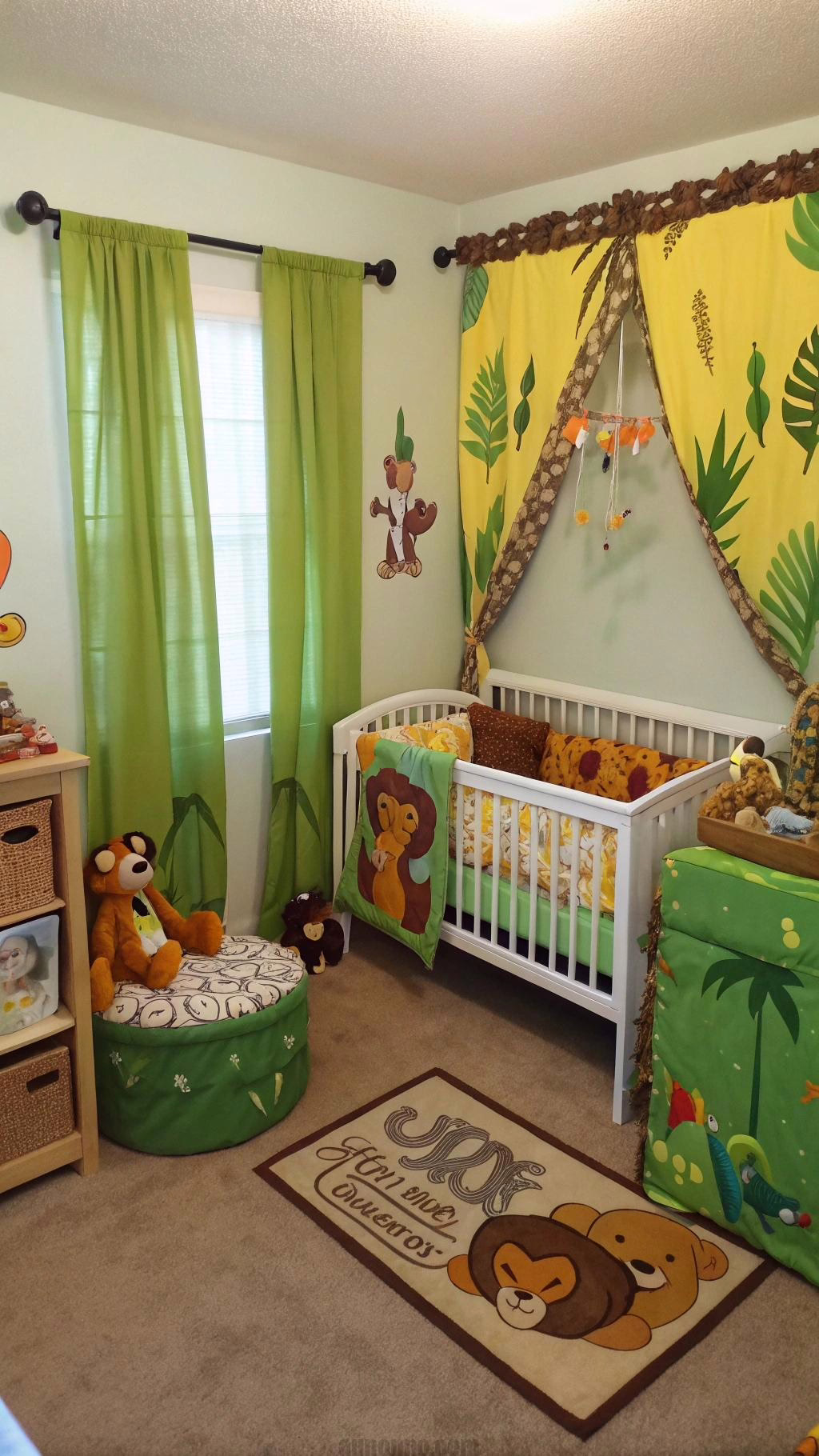 Incorporate furniture that reflects the jungle theme, such as a crib with animal prints or a changing table adorned with leaf motifs. You can also add plush toys of the characters to create a cozy and inviting environment.