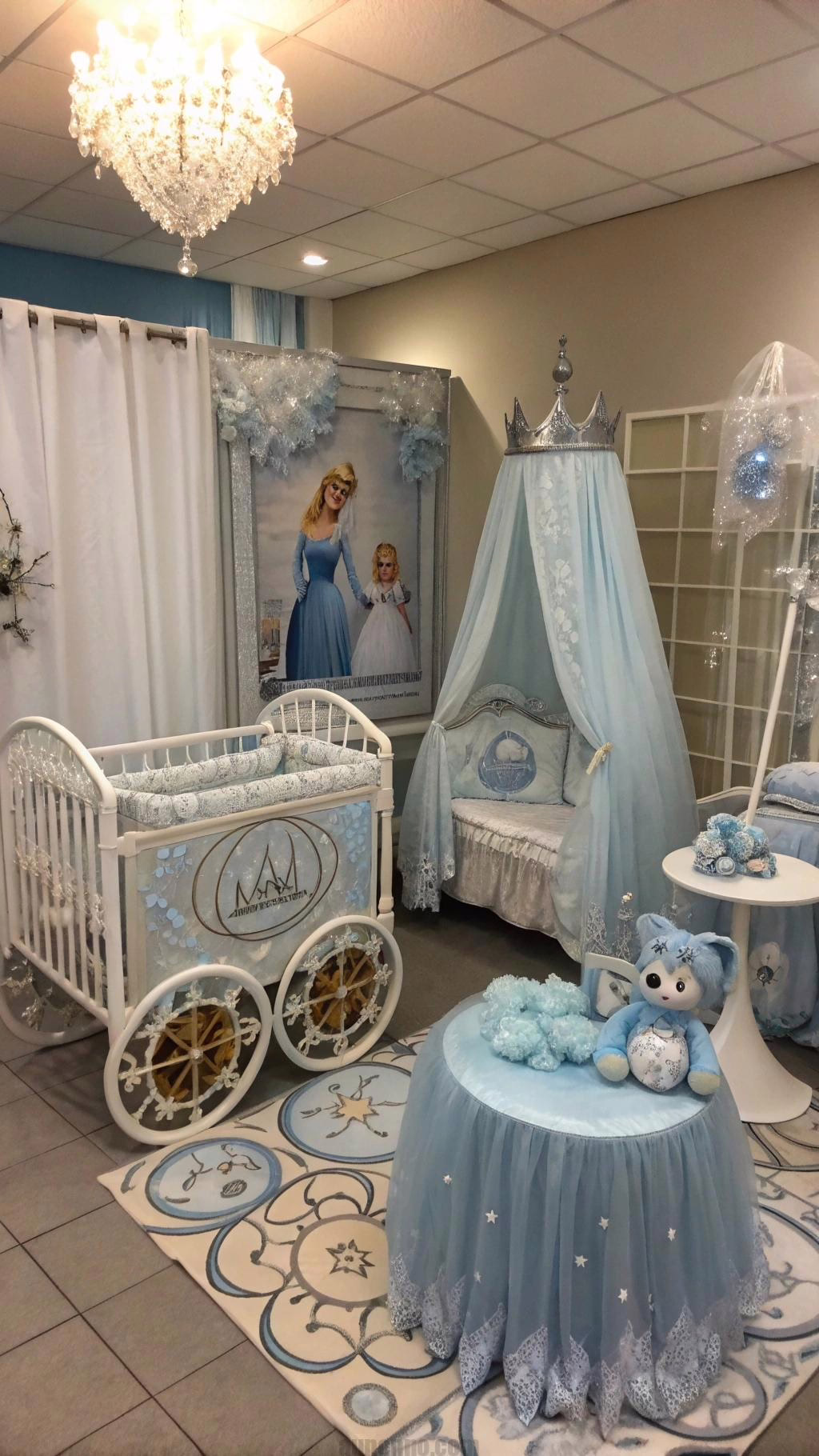 Create a magical nursery inspired by Cinderella and her enchanting story. Use a color palette of soft blues, silvers, and whites to evoke the charm of the fairy tale. Start with Cinderella-themed bedding and curtains that feature Cinderella, her fairy godmother, and the iconic pumpkin carriage.