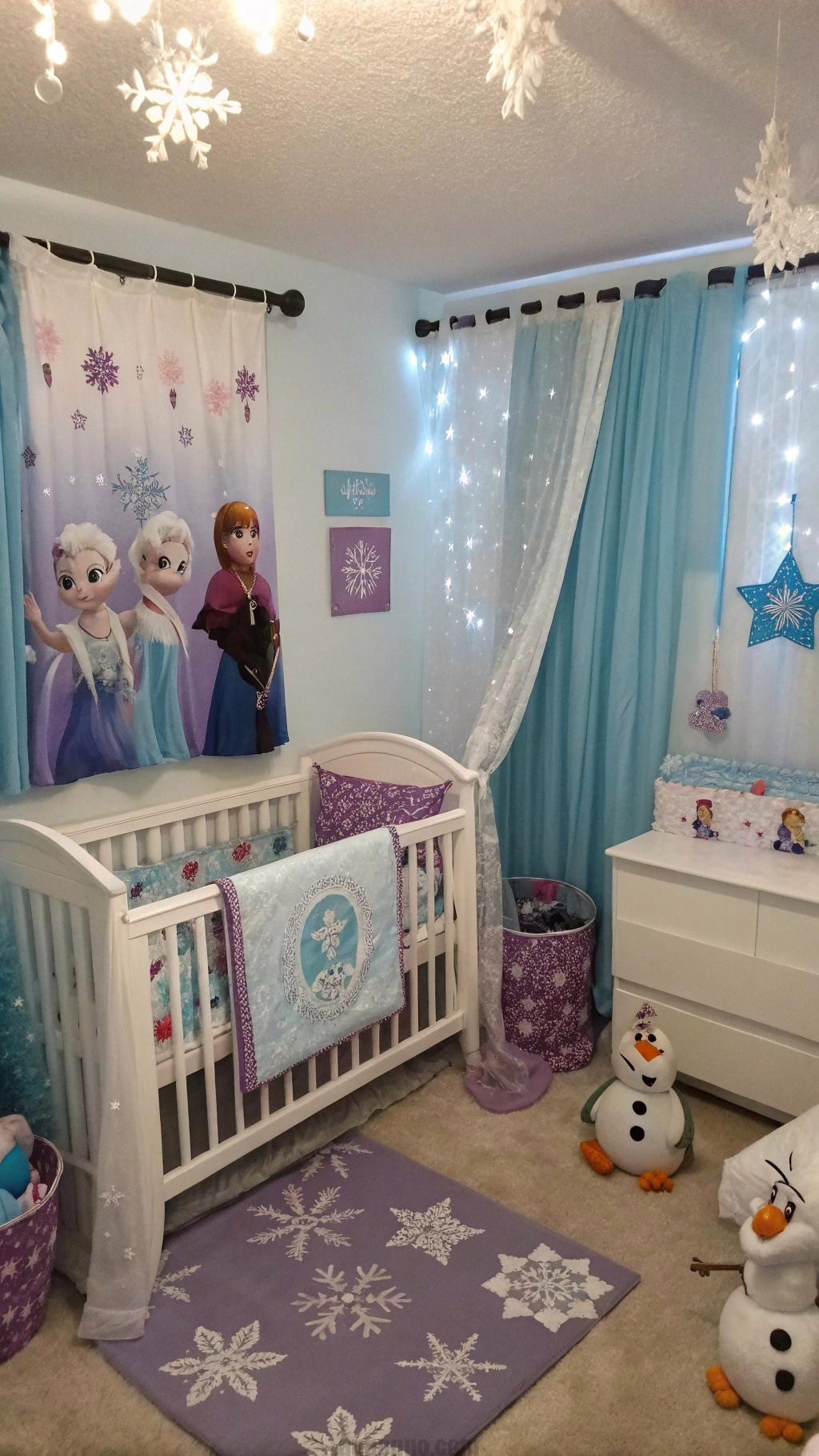 Create a magical winter wonderland with a Frozen-themed nursery. Use a color palette of icy blues, whites, and purples to evoke the enchanting world of Elsa and Anna. Start with Frozen-themed bedding and curtains that feature the beloved sisters and their friends.