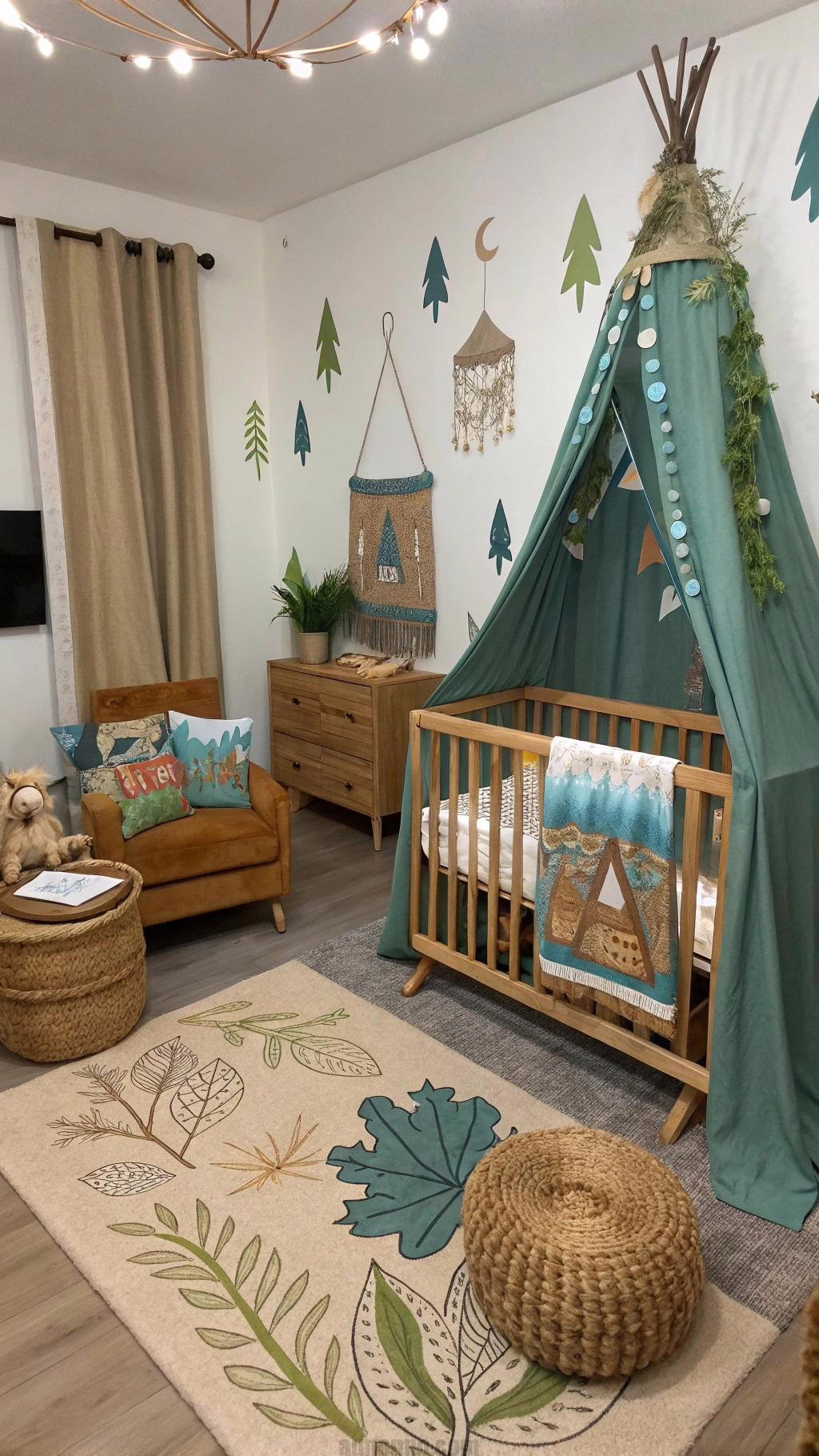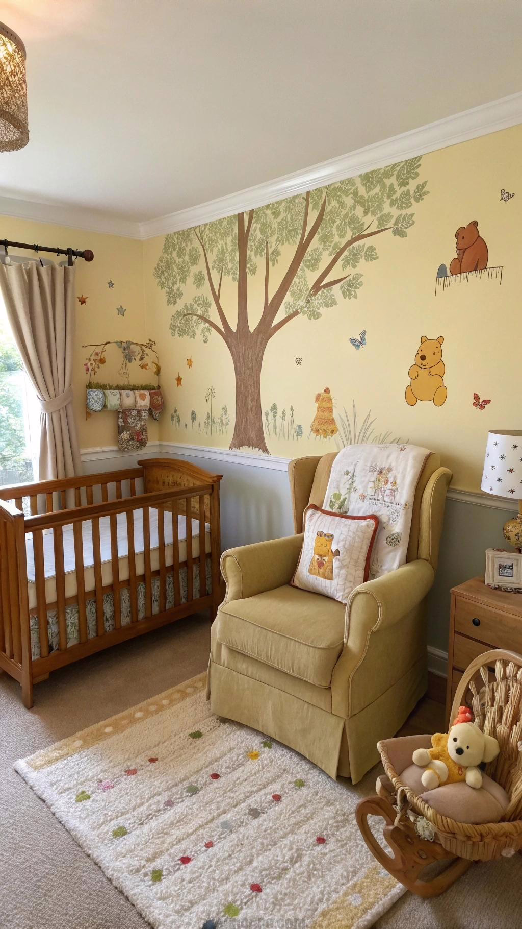 Incorporate cozy furniture, such as a rocking chair for bedtime stories and a crib with soft, plush bedding. You can also add a whimsical touch with wall decals of trees and honey pots, creating a serene environment that feels like a storybook come to life.