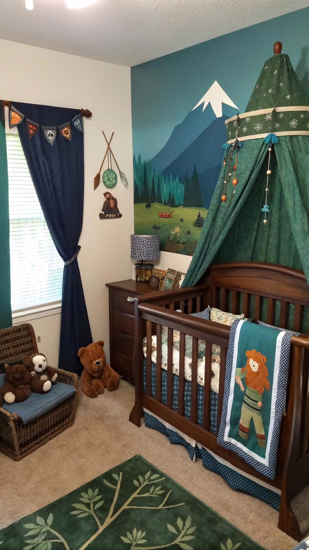 Create a strong and adventurous nursery with a Brave theme, celebrating the spirit of Merida and the Scottish Highlands. Use a color palette of deep greens, blues, and earthy tones to evoke the beauty of the landscape. Start with Brave-themed bedding and curtains that feature Merida, her bow, and her bear brothers.