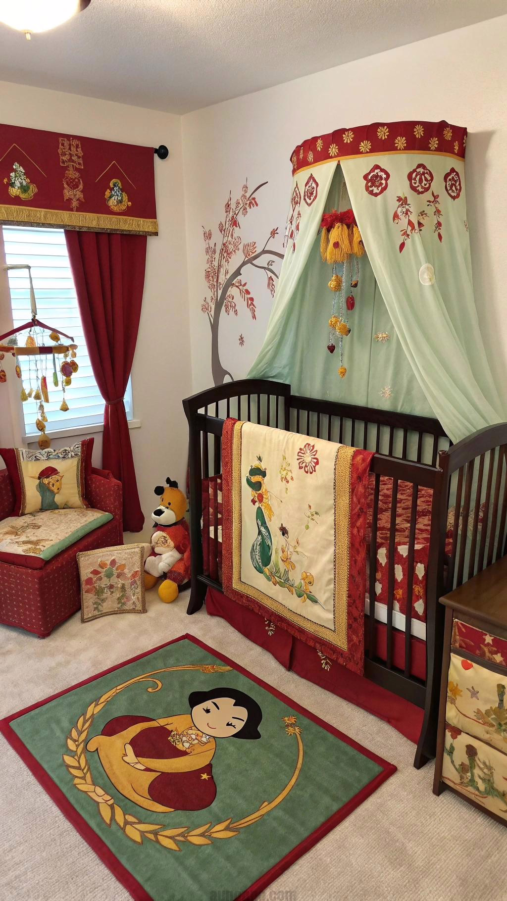 Create a strong and inspiring nursery with a Mulan theme, celebrating bravery and adventure. Use a color palette of rich reds, golds, and greens to evoke the beauty of ancient China. Start with Mulan-themed bedding and curtains that feature Mulan, Mushu, and other characters.