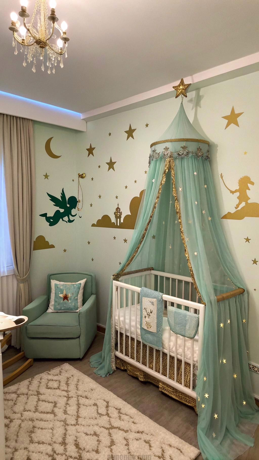 Create a whimsical nursery inspired by Peter Pan and the enchanting world of Neverland. Use a color palette of soft greens, blues, and golds to evoke a sense of adventure and magic. Start with Peter Pan-themed bedding and curtains that feature characters like Tinkerbell and the Lost Boys.