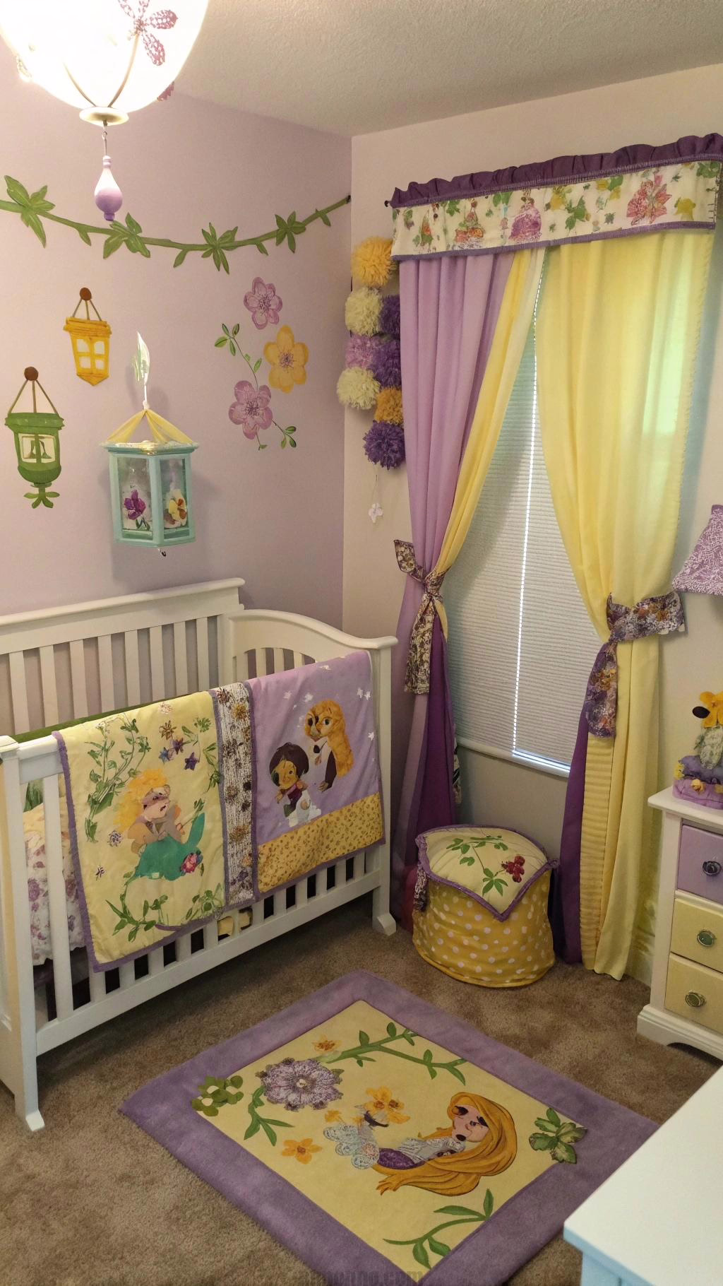 Create a whimsical nursery inspired by Tangled and the adventures of Rapunzel. Use a color palette of soft purples, yellows, and greens to evoke the charm of the fairy tale. Start with Tangled-themed bedding and curtains that feature Rapunzel, Pascal, and Flynn Rider.