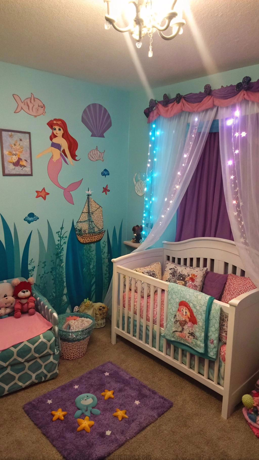 Dive into an enchanting underwater world with a Little Mermaid-themed nursery. Use a color palette of ocean blues, purples, and coral pinks to create a magical atmosphere. Start with Little Mermaid-themed bedding and curtains that feature Ariel, Flounder, and Sebastian.