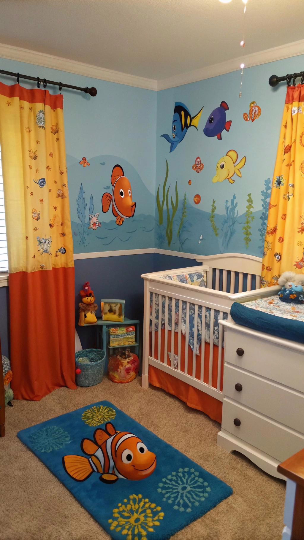 Dive into an underwater adventure with a Finding Nemo-themed nursery. Use vibrant colors like ocean blue, coral orange, and sunny yellow to create a lively atmosphere. Start with bedding and curtains featuring Nemo, Dory, and other beloved characters from the film. Wall decals of colorful fish and underwater scenes can transform the nursery into an aquatic paradise.