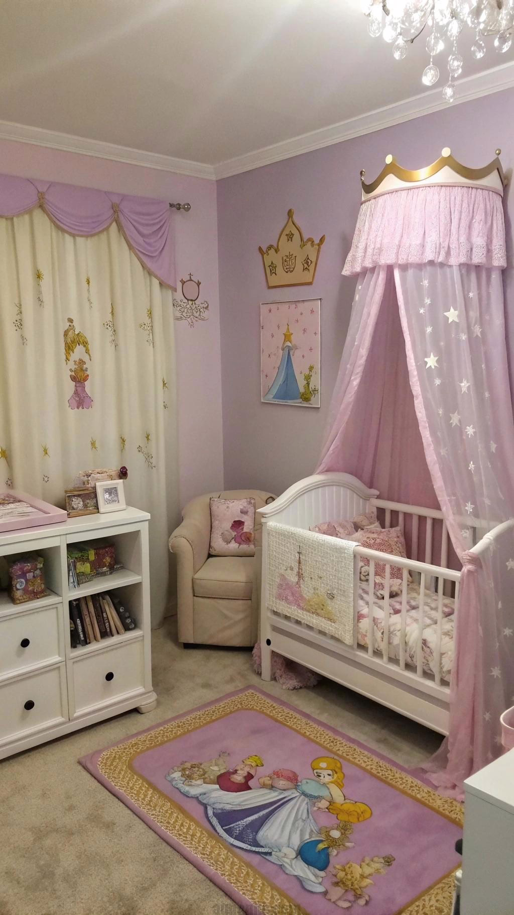 Incorporate elegant furniture pieces, such as a white crib with ornate details and a changing table that complements the princess theme. You can also add a cozy reading nook with a small bookshelf filled with Disney princess storybooks, encouraging a love for reading from an early age.