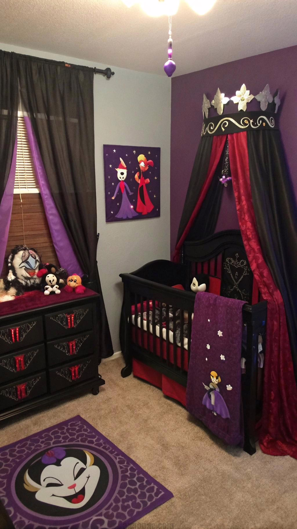 Incorporate furniture that reflects the theme, such as a crib with gothic designs or a changing table adorned with villainous motifs. You can also add plush toys of the characters to create a cozy yet intriguing environment.