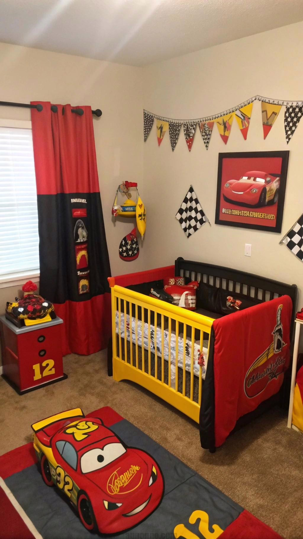 For little ones who love speed and adventure, a Cars-themed nursery can be a thrilling choice. Use a color palette of red, black, and yellow, reminiscent of Lightning McQueen and his friends. Start with Cars-themed bedding and curtains that feature the iconic characters from the movie.