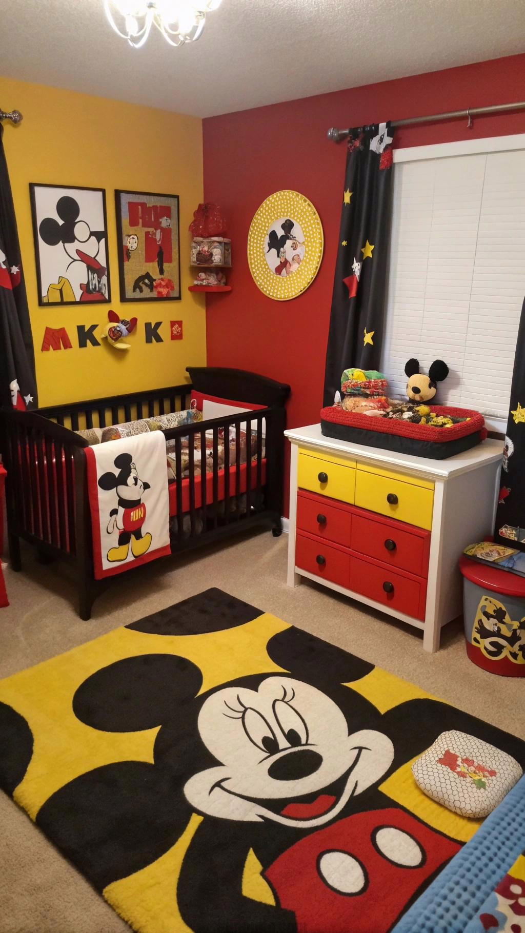 Transform your nursery into a Mickey Mouse wonderland with bold colors and playful designs. Start with a classic red, black, and yellow color palette, incorporating Mickey Mouse-themed bedding, curtains, and wall art. You can also add plush Mickey toys and a Mickey-shaped rug to enhance the theme. Consider painting one wall with a large mural of Mickey and his friends for a stunning focal point.