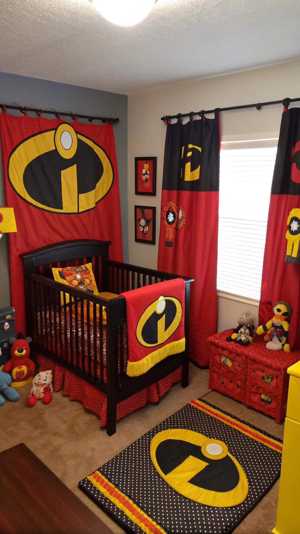 Transform your nursery into a superhero hideout with an Incredibles theme. Use a bold color palette of red, black, and yellow to create an energetic and adventurous atmosphere. Start with Incredibles-themed bedding and curtains that feature Mr. Incredible, Elastigirl, and their super-powered kids.