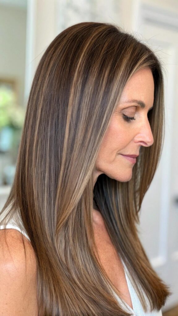 Long, straight hair is a classic and timeless look that can be incredibly elegant for women in their 40s. This hairstyle is versatile and can be worn for various occasions, from casual outings to formal events. Long, straight hair can also be enhanced with layers or subtle highlights for added dimension.