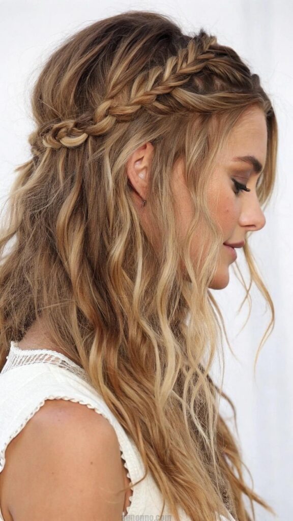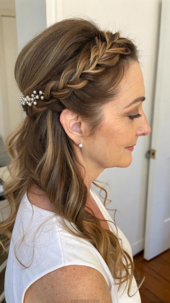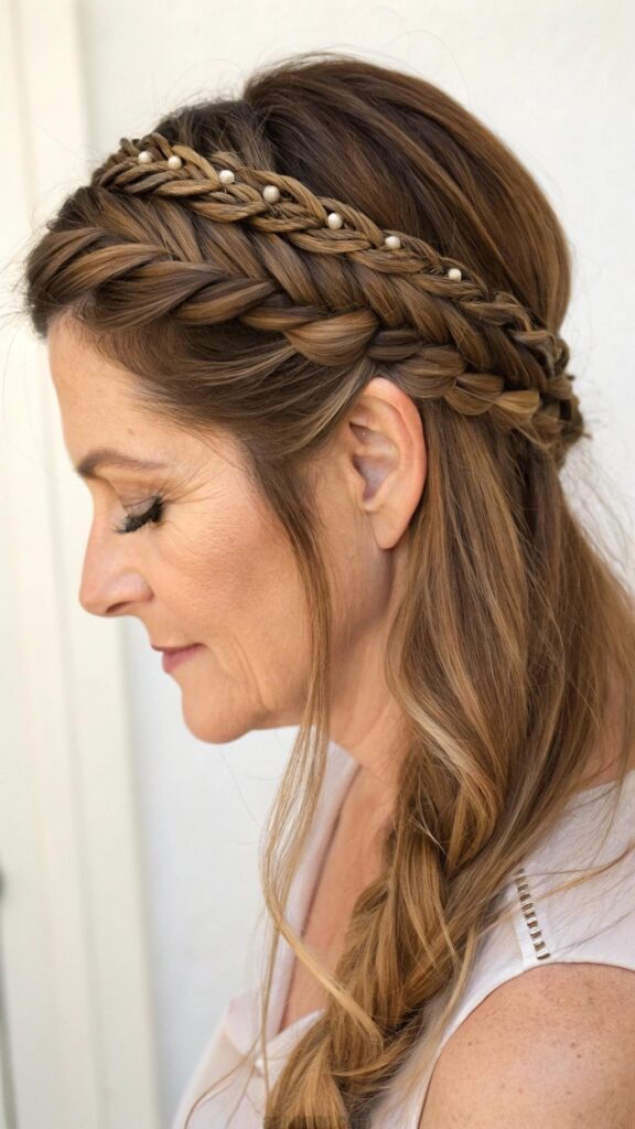 The braided crown is a beautiful and romantic hairstyle that adds a whimsical touch to any look. This style works well for medium to long hair and is perfect for women in their 40s who want to embrace their femininity. The braided crown can be worn for casual outings or more formal events, making it a versatile choice.