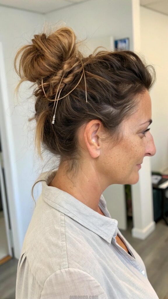 The messy bun is a relaxed and effortless hairstyle that is perfect for busy women in their 40s. This style is not only practical but also chic, making it a go-to option for casual outings or even a day at the office. The messy bun can be customized to suit your personal style, whether you prefer a more polished look or a carefree vibe.