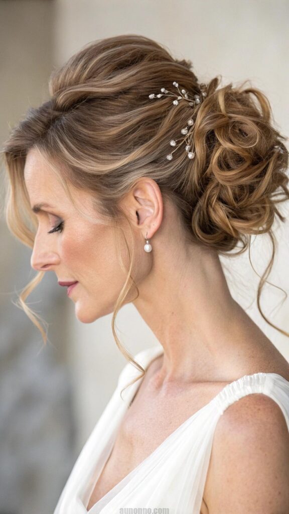The soft, romantic updo is a beautiful hairstyle that is perfect for special occasions, such as weddings or formal events. This style is characterized by loose, flowing tendrils and soft curls, creating an ethereal and feminine look. It’s ideal for women in their 40s who want to exude elegance and grace.