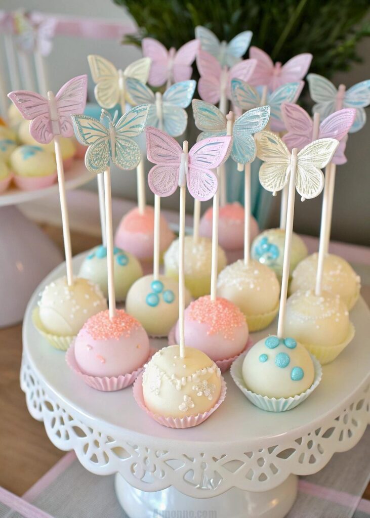Serve butterfly-themed cake pops as a fun and portable dessert option. Decorate them with pastel icing and edible butterfly toppers.